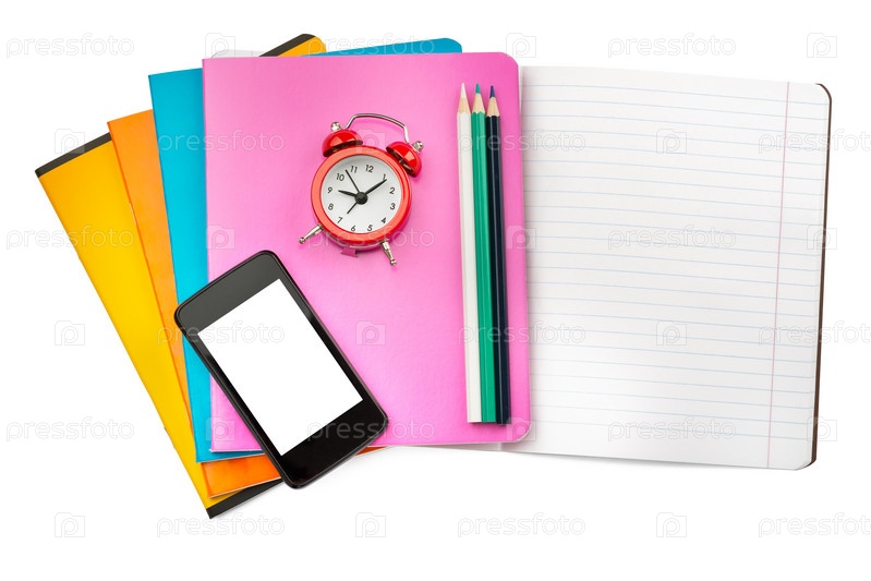 Тетради, смартфон, карандаши и будильник