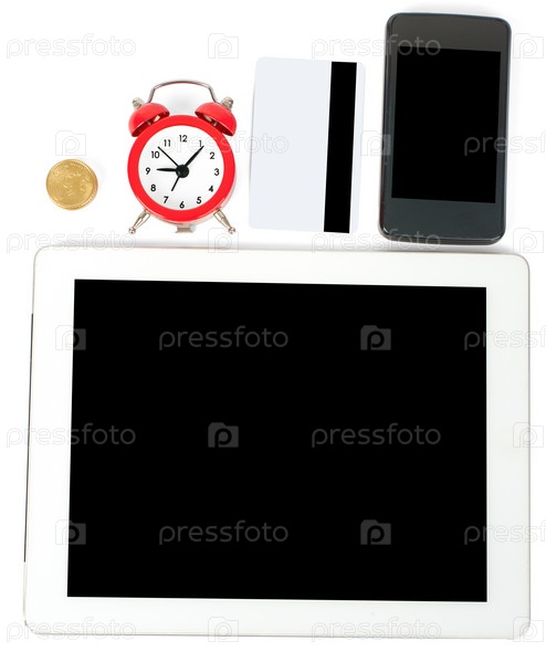 Планшет, смартфон, кредитка, монета и будильник