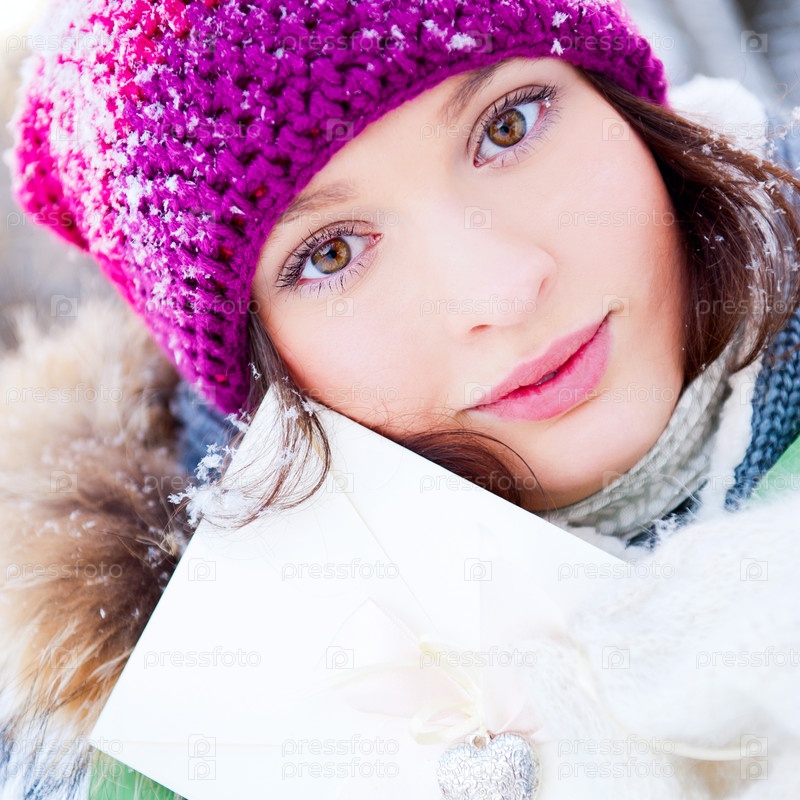 молодая женщина на улице держит валентинку и смотрит в камеру