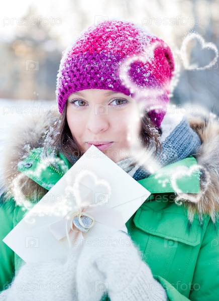 молодая женщина на улице держит валентинку и смотрит в камеру