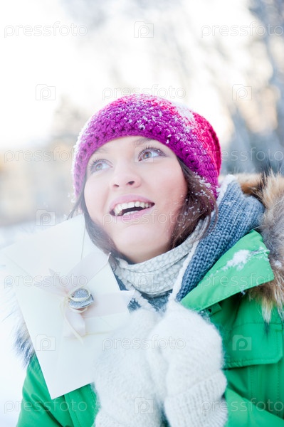 молодая женщина на улице держит валентинку и смотрит в камеру