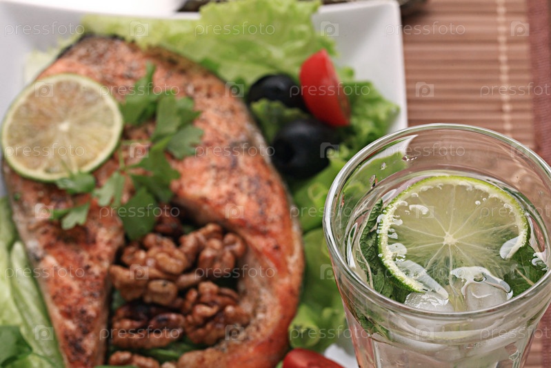 Лосось на гриле с салатом и орехами