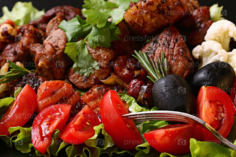 На гриле мясо с овощами