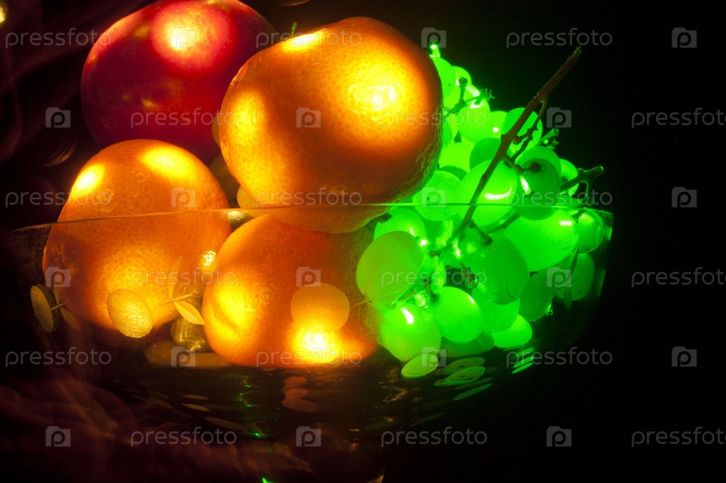 Светящиеся фрукты, на темном фоне