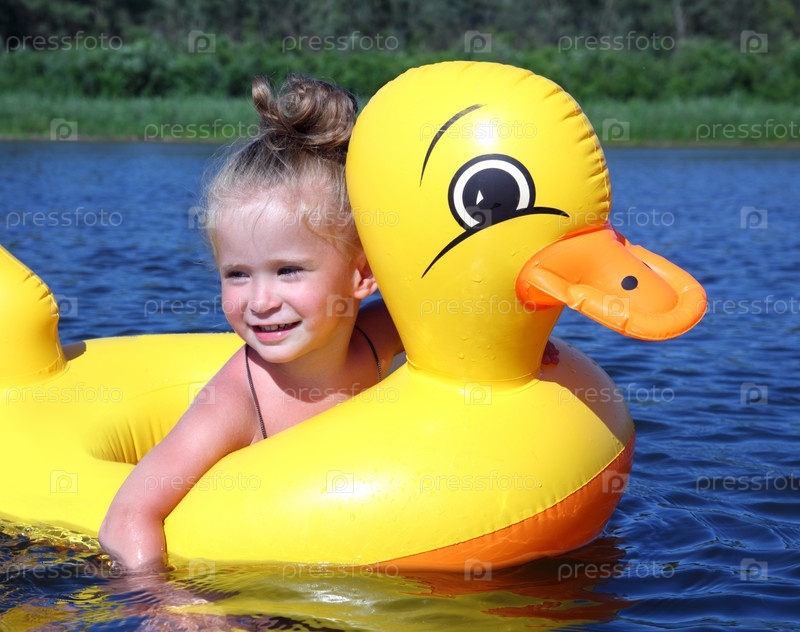 Девочка купается в реке с надувной уткой