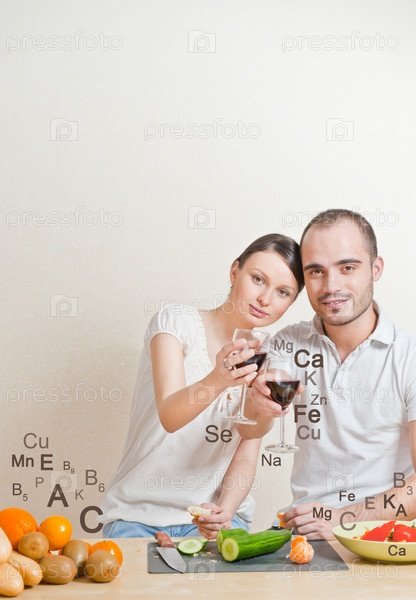 Молодая пара на кухне пьет вино и наслаждается процессом приготовления пищи