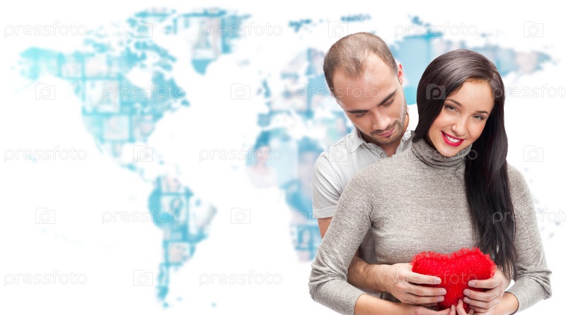 Счастливая пара с красным сердцем в руках на фоне карты мира