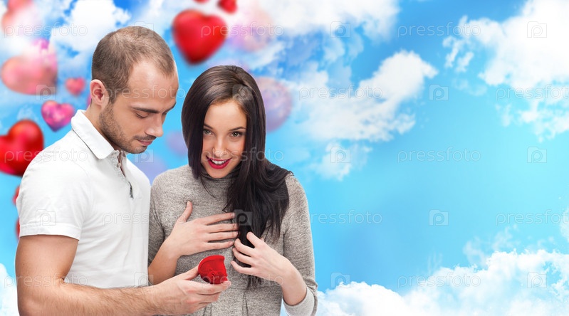 Молодой человек делает предложение своей девушке на фоне неба