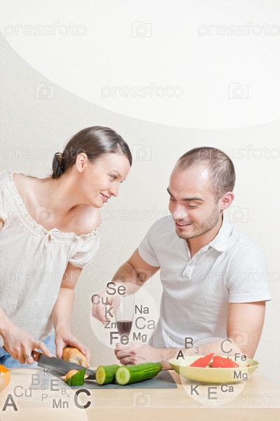 Молодая пара на кухне пьет вино и наслаждается процессом приготовления пищи