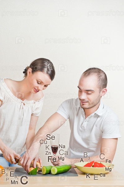 Молодая пара на кухне пьет вино и наслаждается процессом приготовления пищи