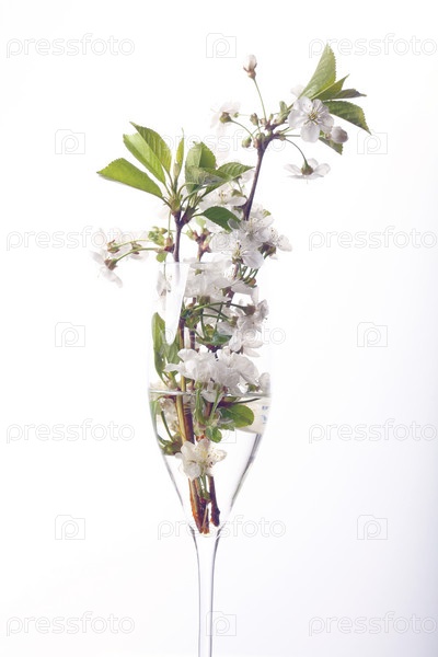 Вишни в цвету в стекло белый фон