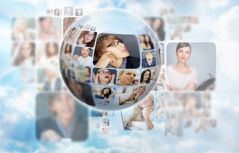Земной шар с фотографиями лиц разных людей, на голубом фоне фотографий. Социальная сеть и коммуникации