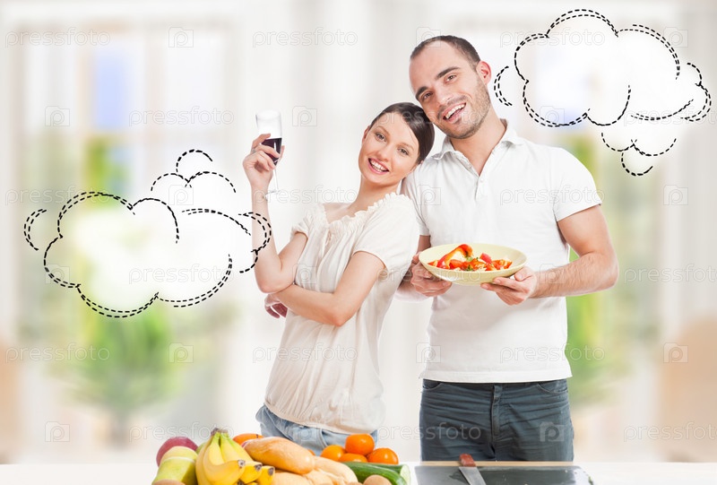 Молодая пара пьет вино и наслаждается процессом приготовления пищи