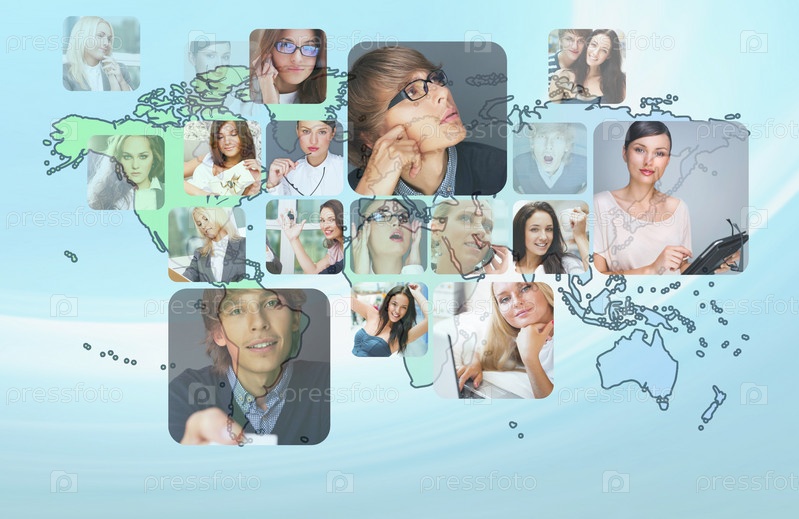 Карта мира и фотографии разных людей по всему миру на голубом фоне. Концепция Интернет-сообщество