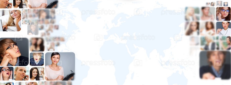 Карта мира и фотографии разных людей по всему миру. Концепция Интернет-сообщество