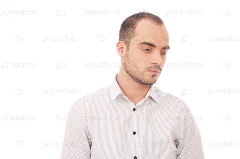 Портрет молодого человека, смотрящего вниз, изолированный на белом фоне