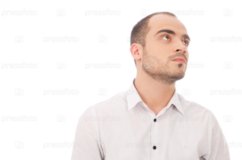 Портрет молодого человека, смотрящего вверх, изолированный на белом фоне
