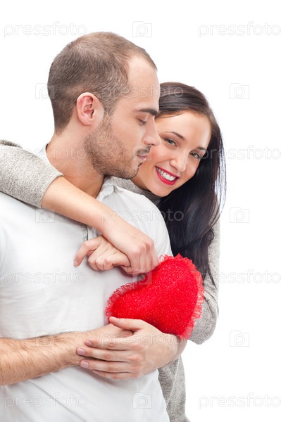 Портрет обнимающейся молодой пары с красным сердцем, изолированной на белом фоне