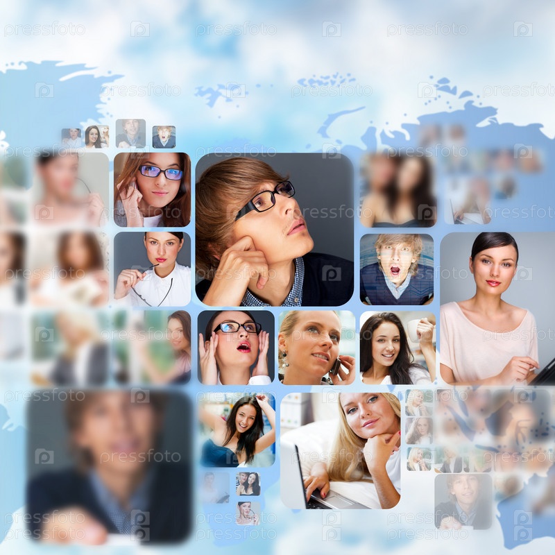 Карта мира и фотографии разных людей по всему миру. Концепция Интернет-сообщество