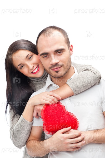 Портрет счастливой молодой пары с красным сердцем, изолированной на белом фоне