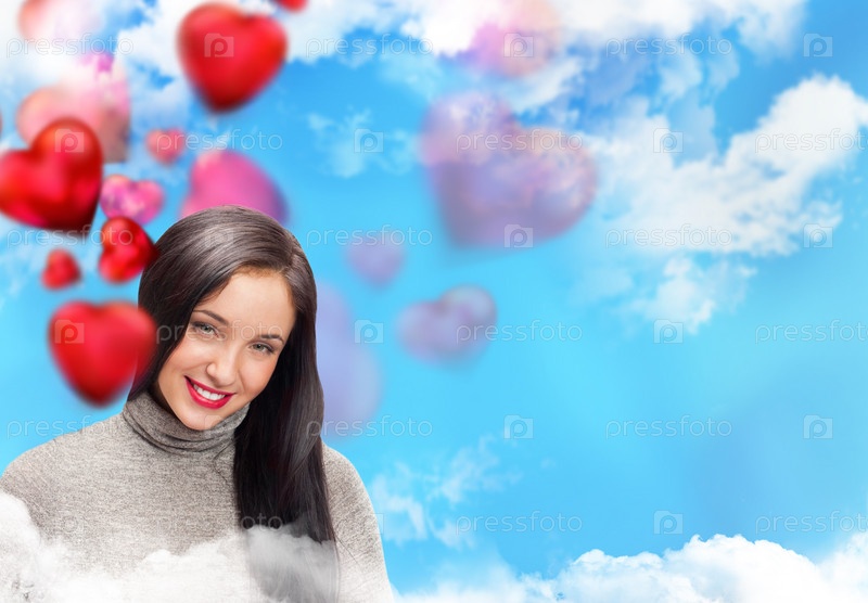 Улыбающаяся девушка на фоне голубого неба, белых облаков и красных сердец