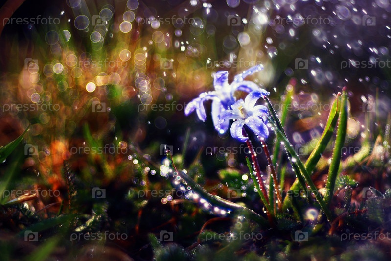 Синий небольшие цветы подснежники, весенний пейзаж