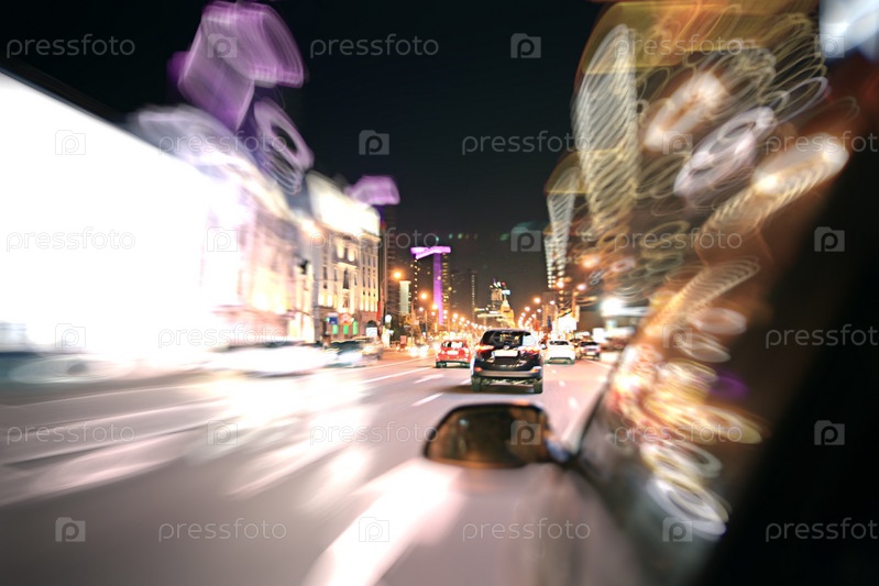 Затуманенное городской вид ночи движения автомобиля