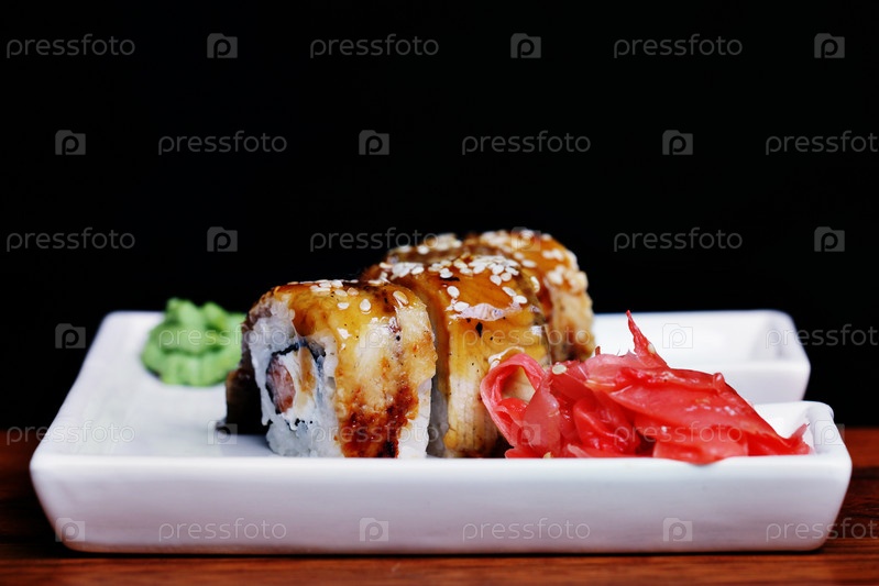 Рулоны на тарелку с черным фоном