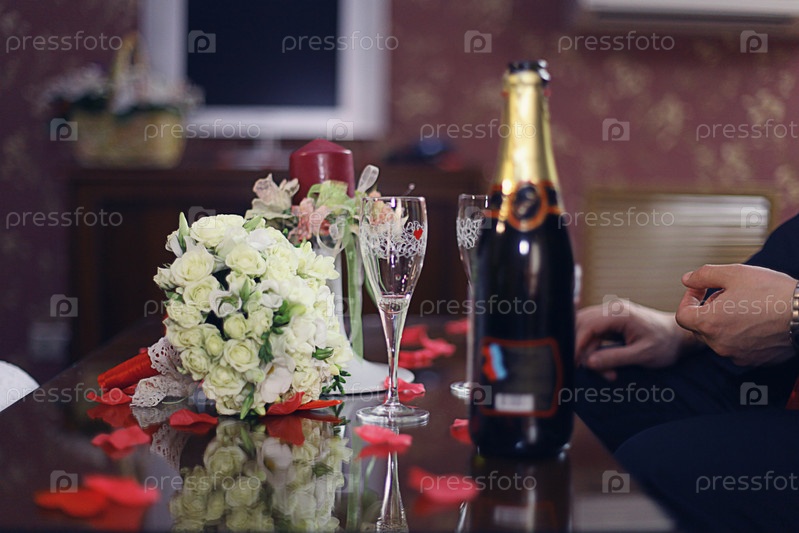 Шампанское и свадебный букет