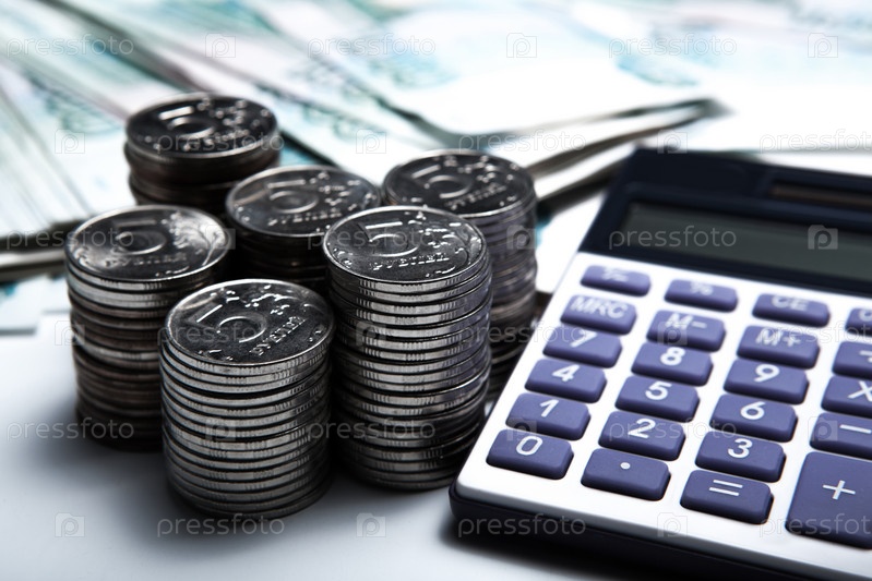 Деньги в виде банкнот и монет с калькулятор