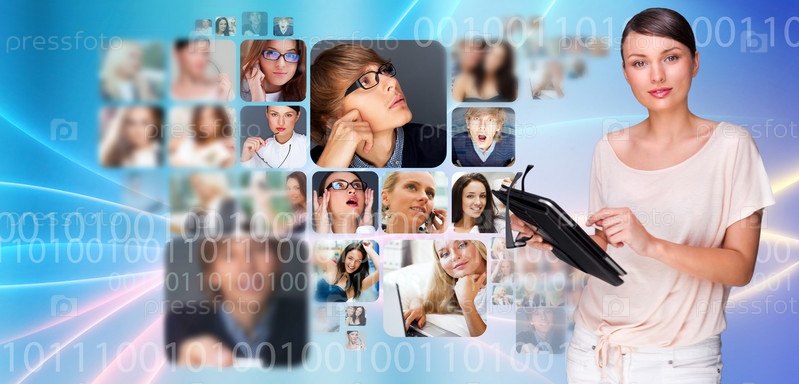 Молодая женщина работает на современном планшетном компьютере стоя рядом с фотографиями своих друзей или коллег