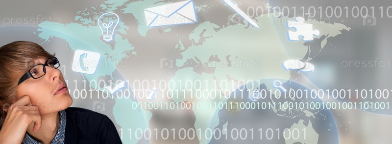 Лицо делового человека, иконки и карта мира на сером фоне. Использование Интернет для быстрого общения и ежедневных дел