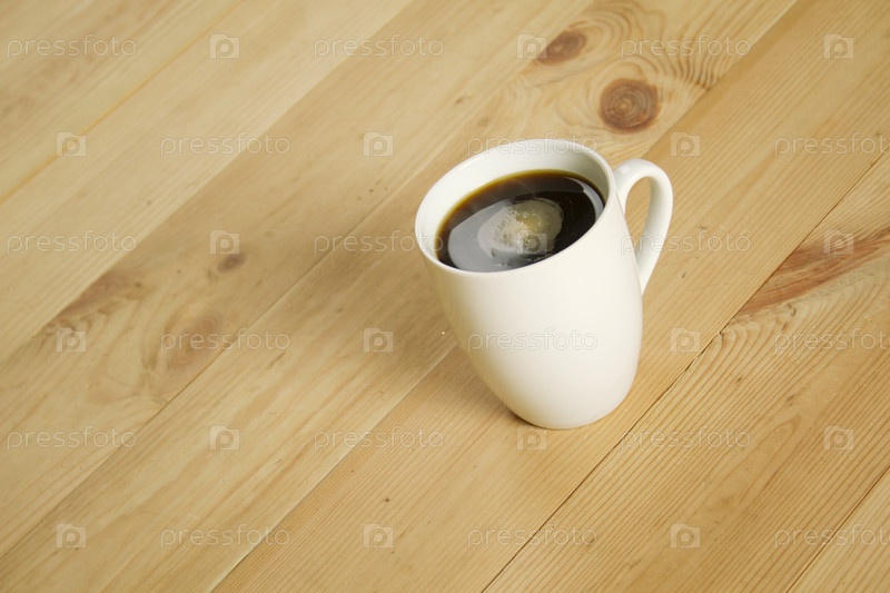Белая кружка с кофе на деревянном полу
