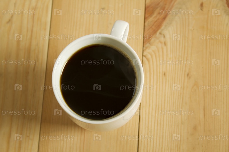 Белая кружка с кофе на деревянном полу