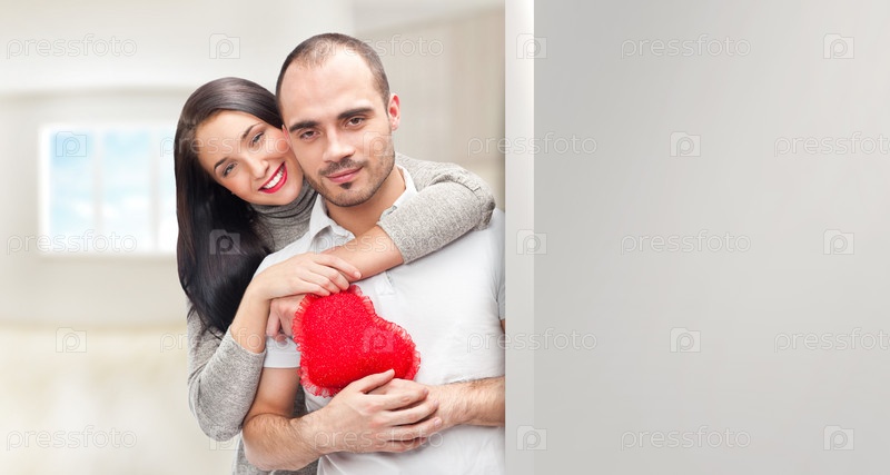 Портрет обнимающейся молодой пары с красным сердцем на фоне окна и свободное пространство для теста на сером фоне