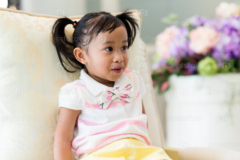 Маленькая девочка, сидя на диване у себя дома