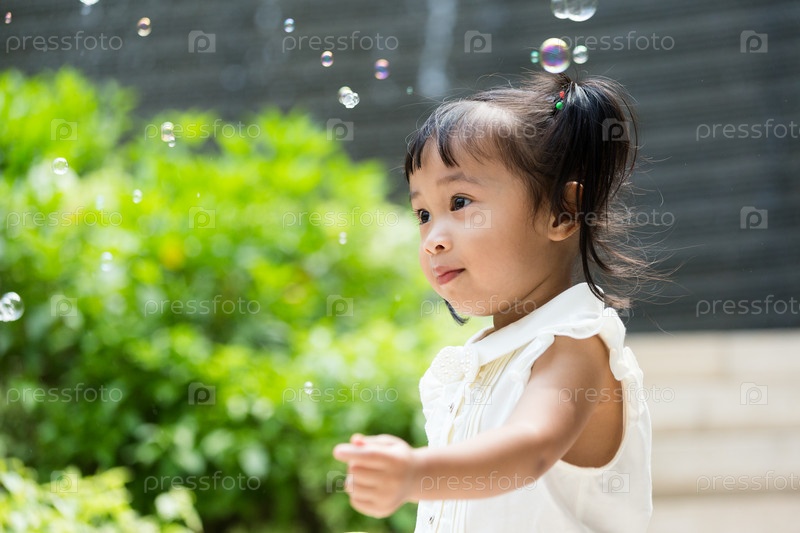 Азиатская девочка играть воздуходувка пузыря на открытом воздухе