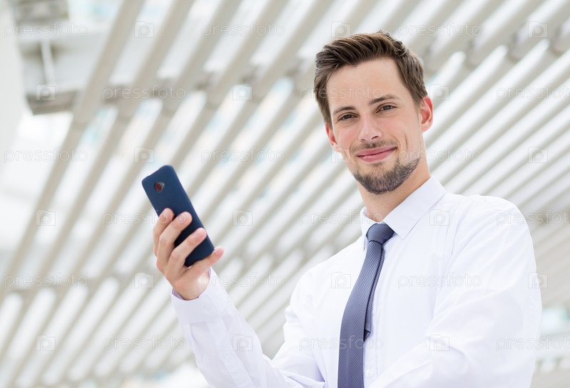 Бизнесмен, проведения мобильных телефонов в открытом воздухе