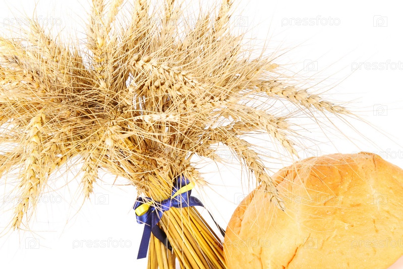 Хлеб и колосья пшеницы на белом фоне