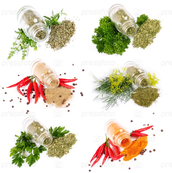 Стеклянные банки с различными приправами на белом фоне
