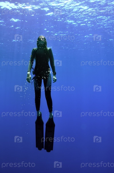 Молодая девушка с длинными плавниками поднимается из глубин моря на поверхность и солнце