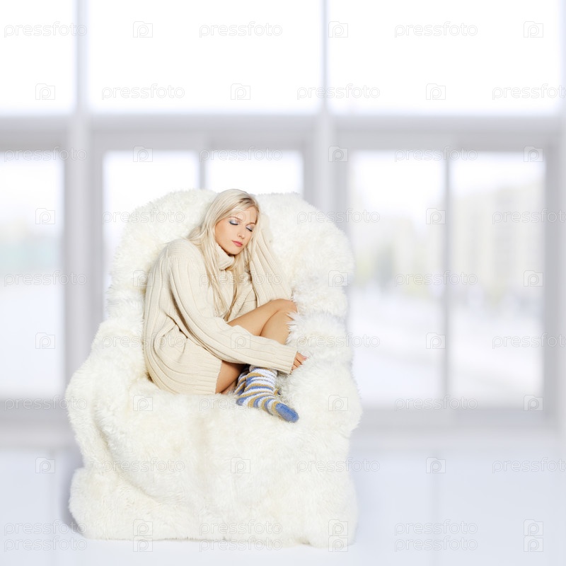 Молодая блондинка сидит в белом пушистом кресле