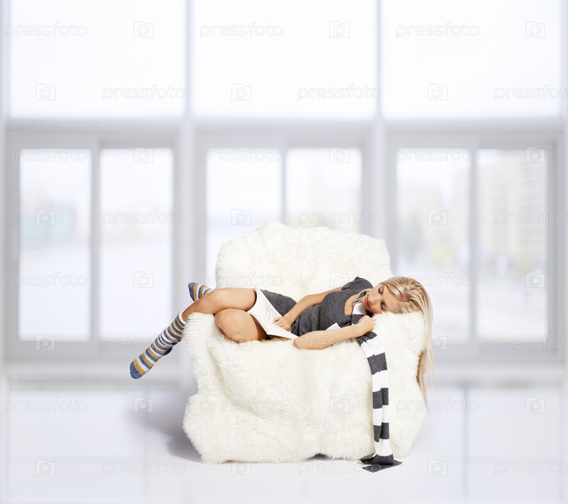 Светловолосая девушка с книгой в белом пушистом кресле