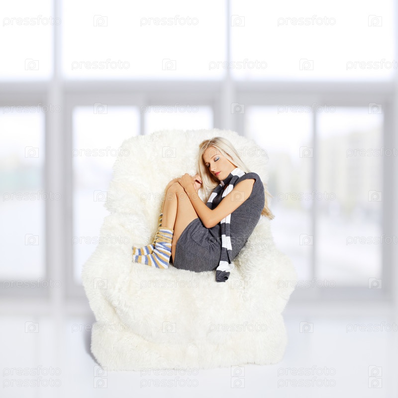 Светловолосая девушка в белом пушистом кресле