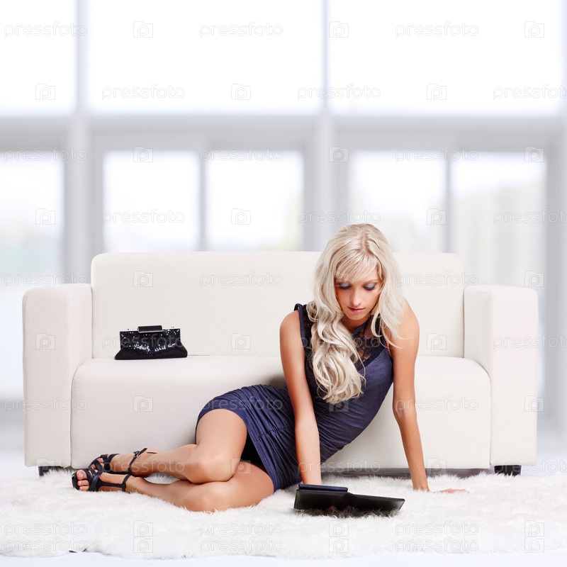 Светловолосая девушка читает электронную книгу, сидя на ковре