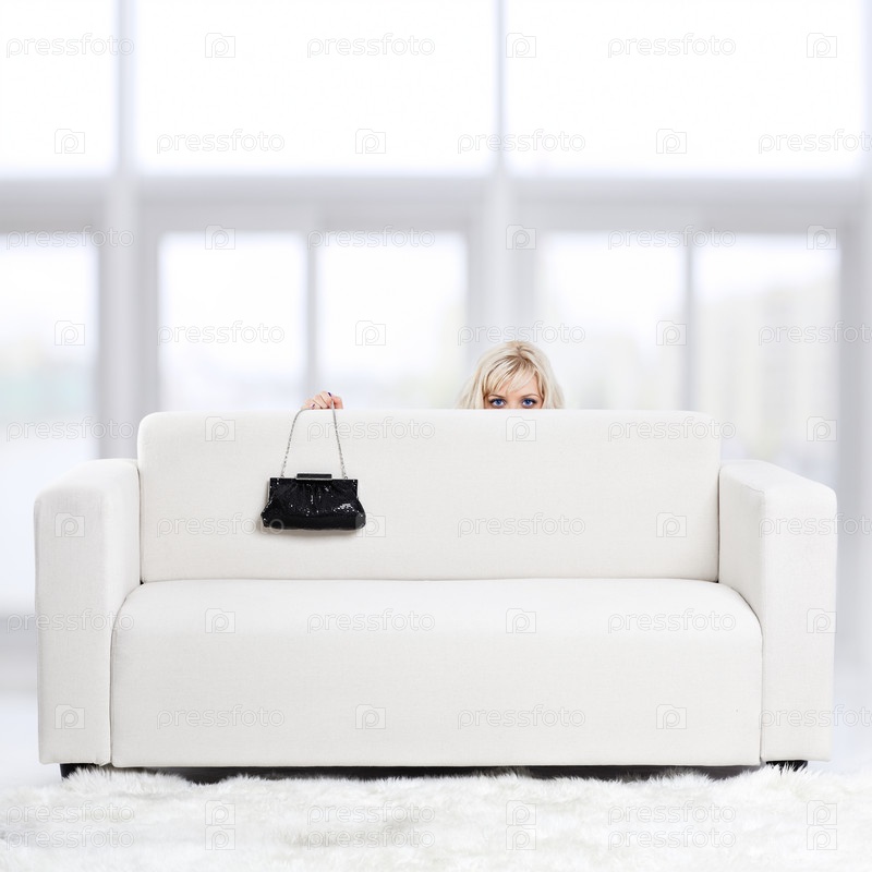 Светловолосая девушка с сумочкой за диваном