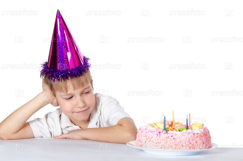 Мальчик в блестящем колпаке сидит за столом с праздничным тортом