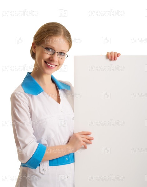 Молодая женщина-врач с пустым баннером на белом фоне