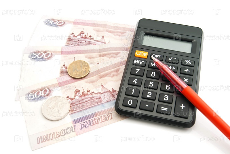 Калькулятор, ручка, банкноты и монеты