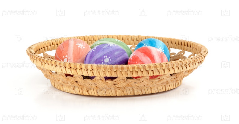 Пасхальные цветные яйца в корзине на белом фоне